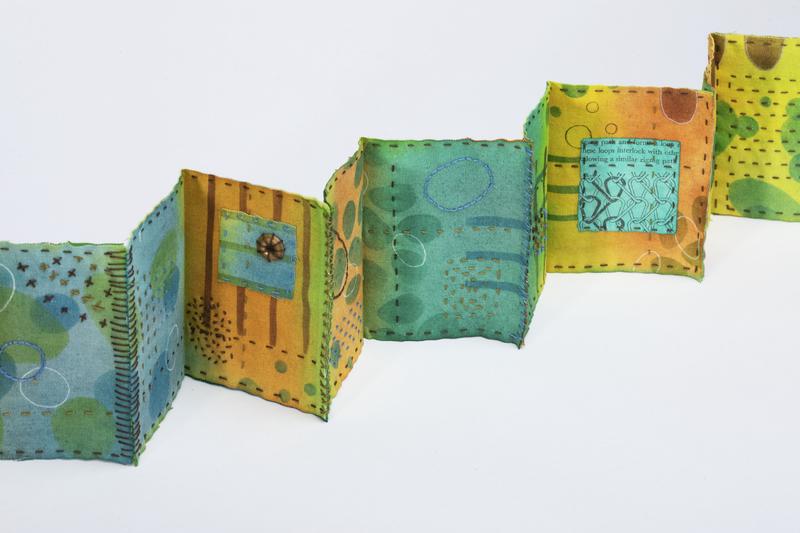 In this class we will use shapes, patterns, and colors as a way to explore the surface design possibilities for fabric and paper. Techniques will include fabric painting, stencil printing, use of natural dyes and earth pigments, embroidery and mending stitches, and incorporating paper, words and objects. At the end of our surface design explorations we will gather our pages and make them into books using structures that work well with fabric including side-sewn, accordion, and pamphlet books. The result will be hand stitched sampler books that are rich and layered, and will reflect your own hand and mark making style. These can be referred to when moving forward with your future book, paper, and textile adventures.